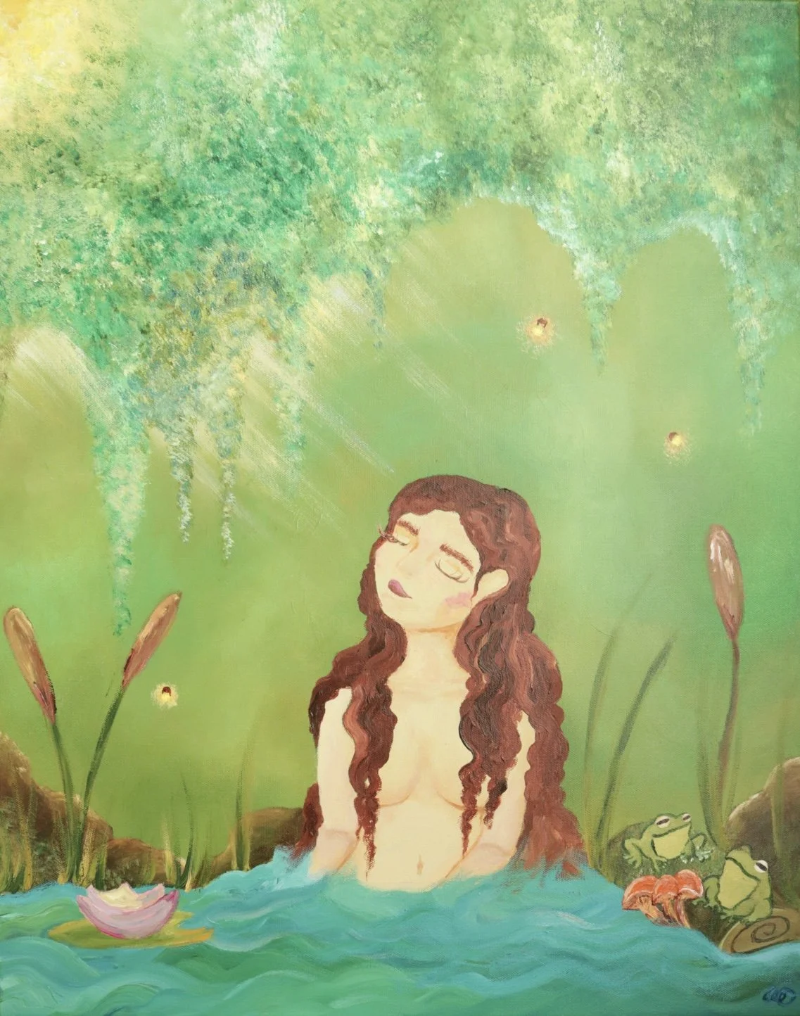 This painting is meant to represent the peace felt within once surrounded by love. The love of others and the love felt inside oneself. The swans and fireflies show to figure that even though physically she may be alone, she never truly is.