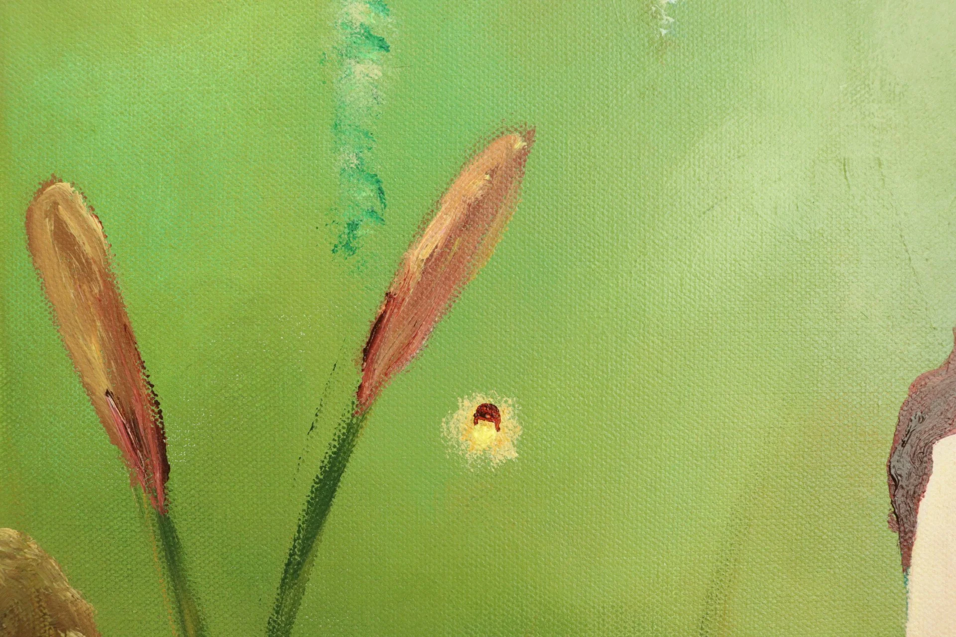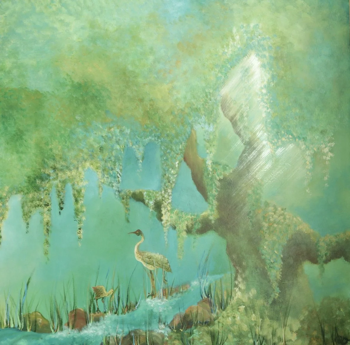 This painting is meant to show peace within. The two cranes representing an adult accompanying their inner child. Enjoying the presence of one another, they bask in the sunlight of nirvana.