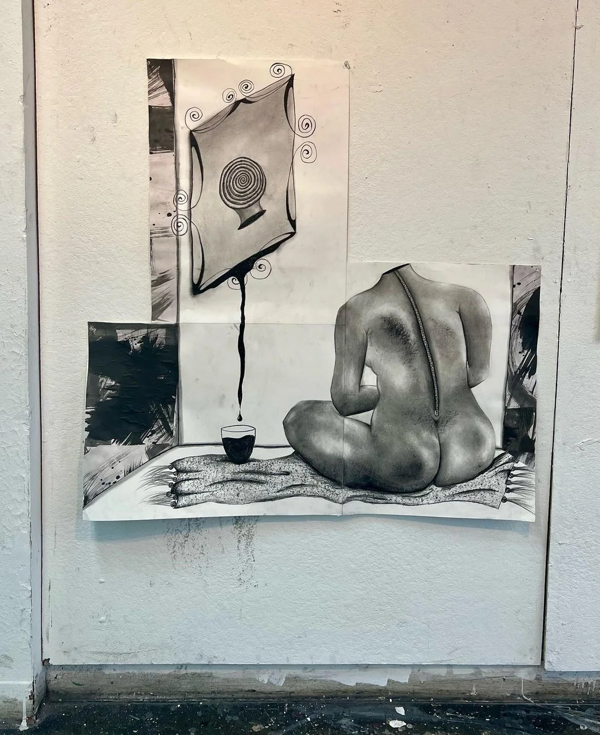 This mixed media work had been done using charcoal, ink and newspaper and graphite pencil with 3 pieces of larger paper taped together.